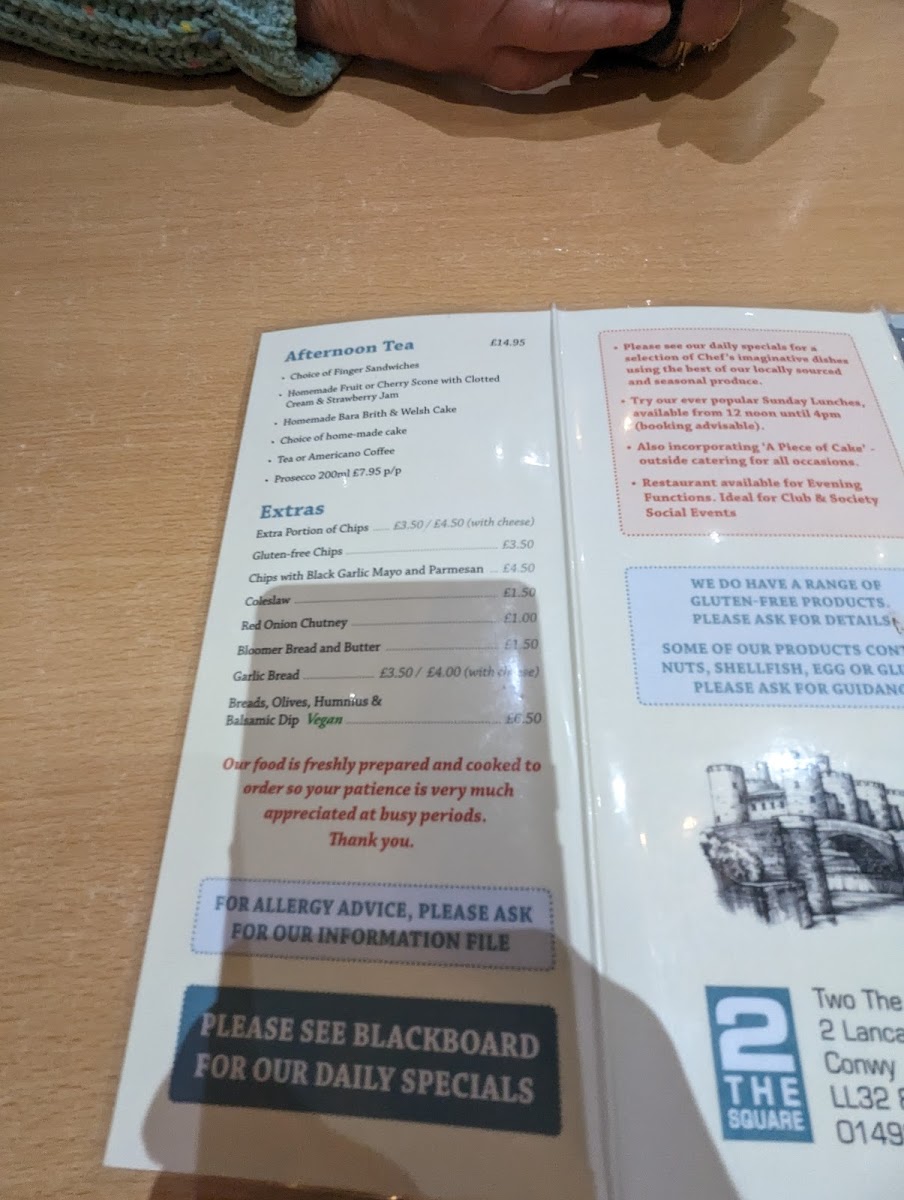 Families will appreciate the Children's Menu, which offers 100% chicken breast goujons, perfect for little ones. The focus on quality is echoed in customer reviews praising the homemade offerings and attentive service. With a welcoming atmosphere, friendly staff, and a commitment to delicious food, 2 The Square is a must-visit for anyone in Conwy.